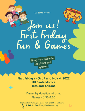 First Friday Fun & Games! Dinner at 6, and Games at 6:30! RSVP to FirstFridayFun@uusm.org so we can let you know what you need to know about parking!
