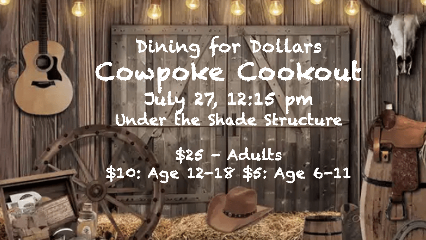 Cowpoke attire is encouraged, Western Bandanas will be provided. This is a summer fun event featuring flavors of the West - Barbecue beef, barbecued chicken tenders, Vegan Chili, cowpoke potatoes, broasted potatoes, coleslaw, corn on the cob, green beans, fresh fruit, and dinner rolls. Desserts will feature Strawberry Shortcake or Hot Fudge Brownie Sundaes. Buy your tickets at the door: Adult $25 each, Teens (ages 11-18) $10 each, and Children (ages 6 - 11) $5 each. Co sponsored by Women's Plus Community.