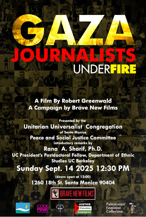 Please join the Faith in Action: Peace & Social Justice Committee (PSJ) and community partners after the service on Sunday, September 14th at 12:30PM for a screening and discussion of Gaza: Journalists Under Fire, a powerful new short documentary (41 min.), from Brave New Films and director Robert Greenwald. PSJ also welcomes co-sponsors Justice 4 Palestine LA and Code Pink Los Angeles. Much organizing work has been done by Roberta Frye and Kate MacQueen to provide us with this latest opportunity for the community to engage with what is happening in Gaza and recommit to taking what action we can.