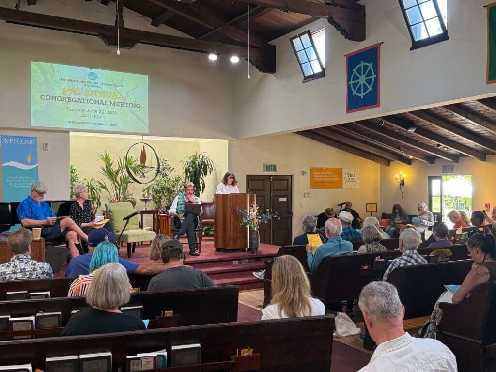 We have so many ministries, committees, and programs of the congregation that are active and making a difference in our community and in the larger world. I wish I could name them all, but that’s why we have an Annual Report of the Congregation that will hopefully capture more than what I have time to share this morning. Our Pastoral Care Team continues to meet monthly to practice the skills of ministry and attend to the needs of our community. They led the efforts to reach out to everyone in the community when the wildfires upended our lives and coordinated resources for our members and friends looking for temporary housing and resources. When rumors circulated of ICE threatening to raid the SaMoHi graduation, they were there at the doors offering their loving support of our students. Our Children and Youth Family Ministry has grown this year, and wonderful things are happening in our sanctuary and in the cottage and even during the week to support our multigenerational life and our commitments to radical inclusion.