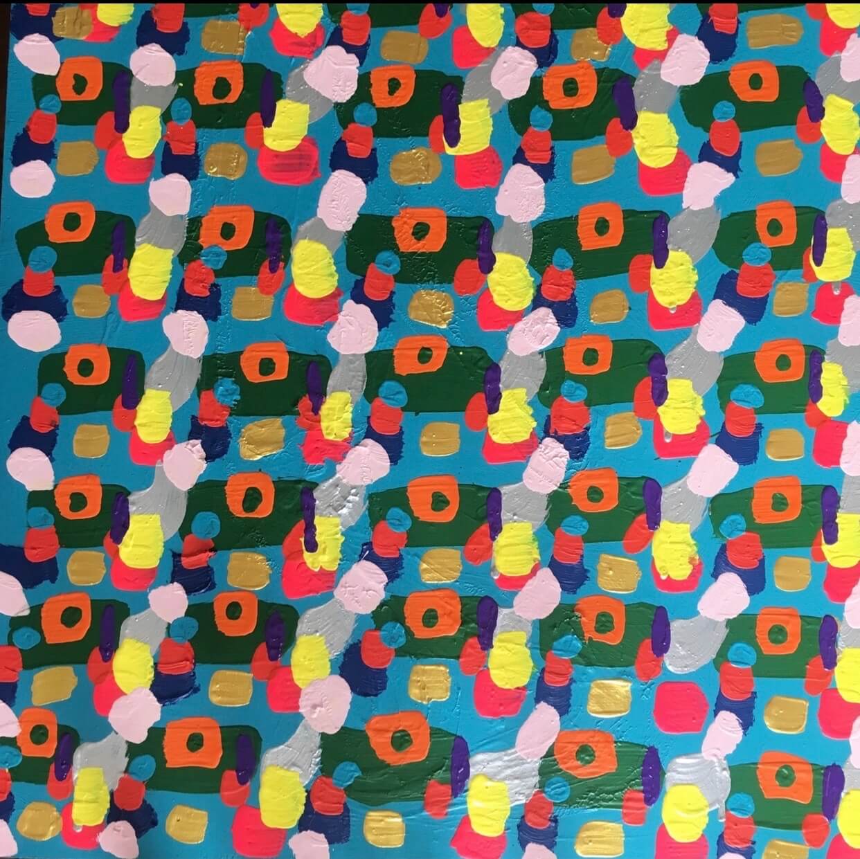 Fansler said, “The paintings in this series function as hypnotic meditations and puzzles. The goal of each is a glimpse at how strange and ever changing color really is. I used colors that pulled deep within a wall and bright hues that pushed into the middle of a room. In the process of arranging these dollops and strokes of color I began to think of color in terms of stacking floors in a sky scraper. I also started to see individual colors as having moods or personalities based on their pushing/pulling positions in the room.”