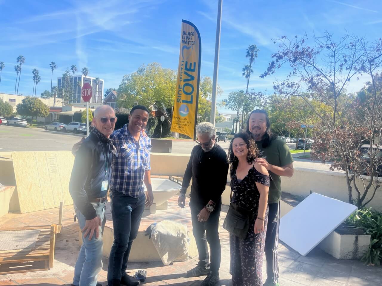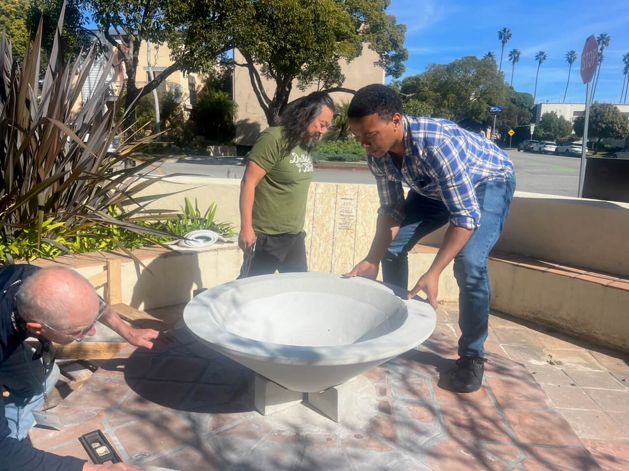 I decided that this empty stage with a 4-inch plumbing stub-out and a derelict electrical box presented an opportunity to re-animate a long-treasured UUSM monument. A landmark. So I got us this sleek, spare, almost austere chalice-shaped planter, which arrived from Oregon in the new year. On a recent Sunday, a few willing congregants and I lifted the 300 lb. ceramic bowl onto the stage and set it on its feet. We now have a new chalice-planter in Anderson Courtyard.