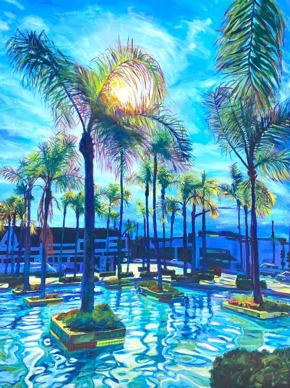 I’m fascinated by the tension and connection between nature and the hand-of-man. Extremes of light and shadow in ordinary locations and situations spark my imagination. They combine to express my vision of an essence of the urban experience. I challenge myself to observe my surroundings with fresh eyes and, through my paintings, express wonder in the constantly changing world—rich in life, vibrant color, and beauty.