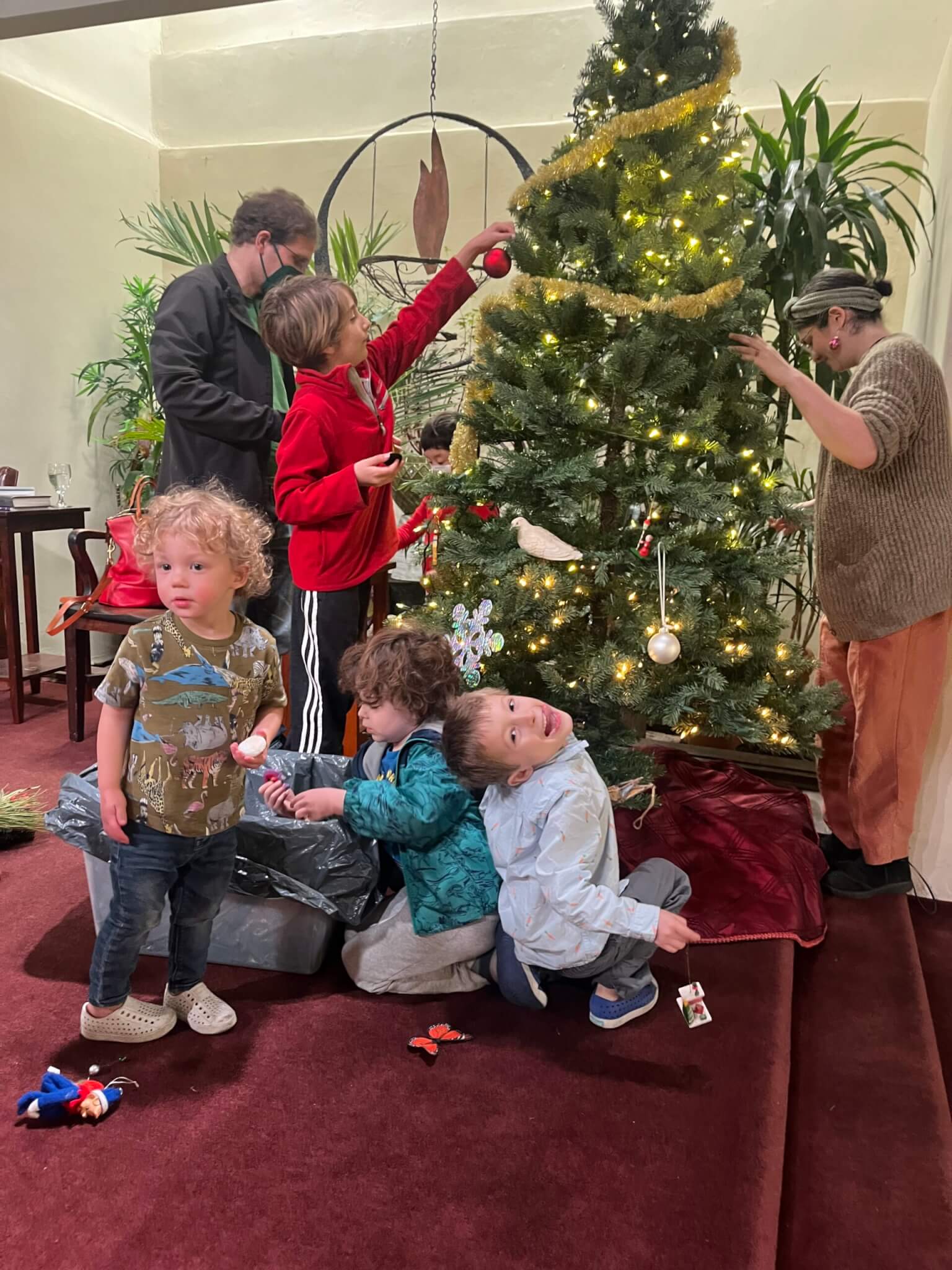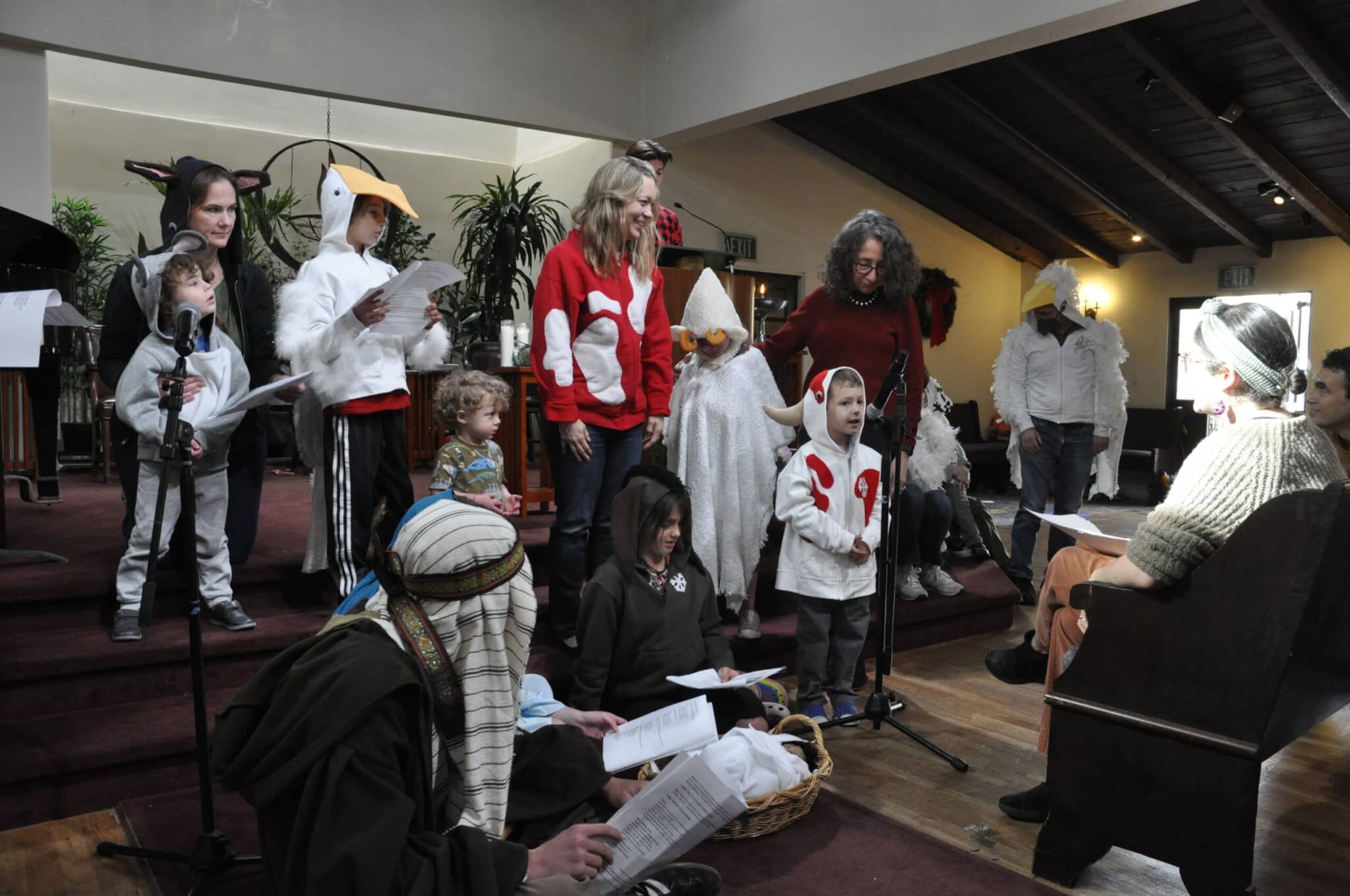 And I am brought to tears, as I watch and listen to Zia, Quinn, Eloise, Sebastian, Theodore, Emerson, and Alex, and Kiran, Delilah, and Ian, as they do what my own kids did twenty-some years ago, wearing the same costumes and masks, and struggling with some of the same bits of dialog, but still telling the story, the sacred story, the beautiful story of wayfaring strangers finding a home among, and welcomed by, friendly beasts.